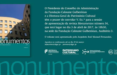 No dia 3 de abril, às 18h30, será apresentada no auditório 3 da sede da Fundação Calouste Gulbenkian, em Lisboa, a revista Monumentos nº 34.
